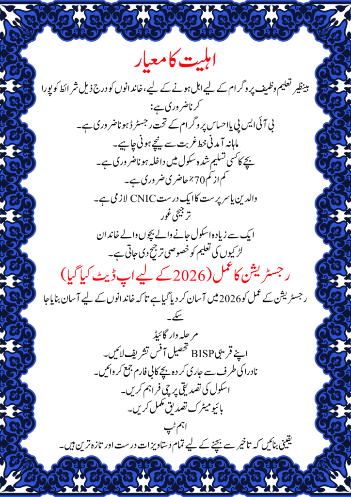 To qualify for the Benazir Taleemi Wazaif program, families must meet the following conditions: