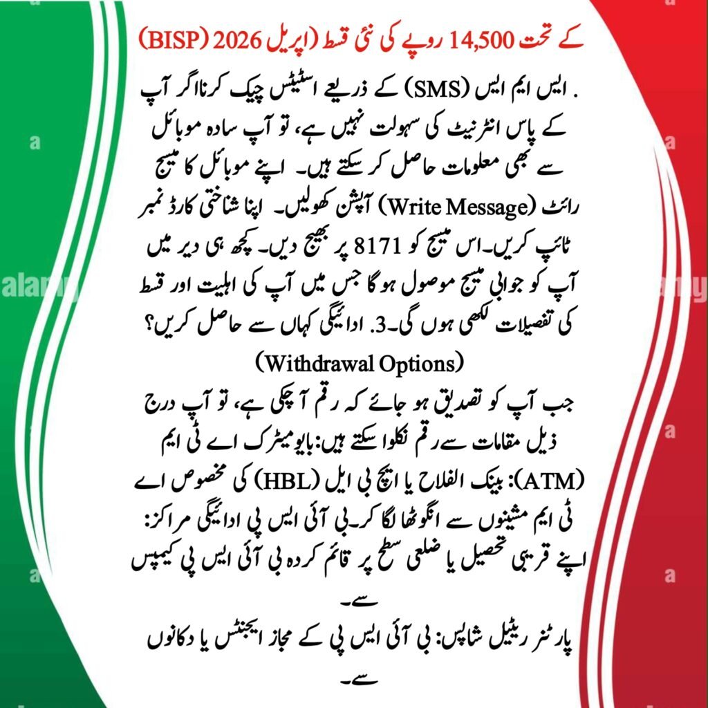 Beneficiaries can receive money from authorized bank ATMs (e.g., HBL, Bank Alfalah) or BISP payment camps using biometric verification.